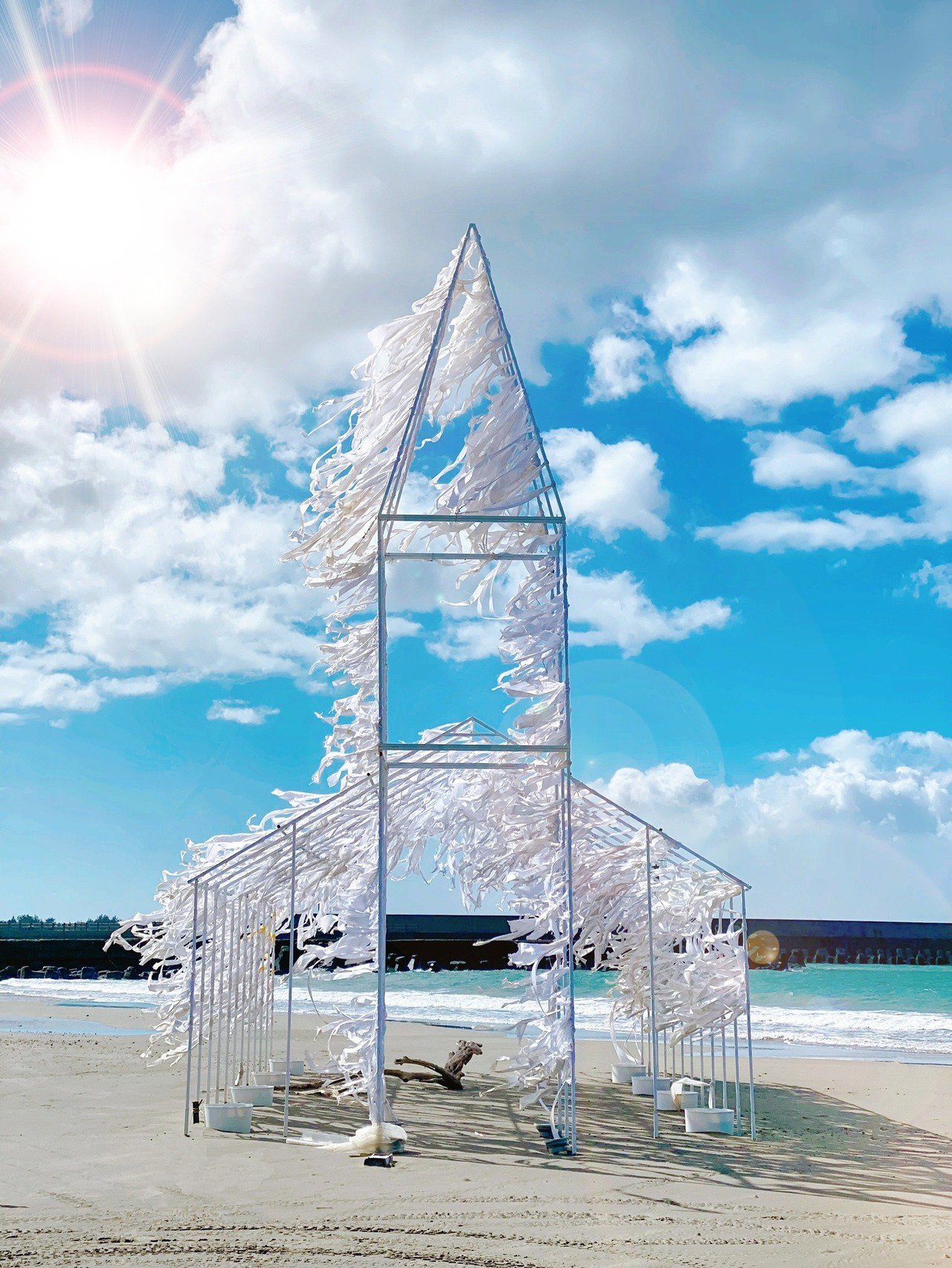2021年落山風藝術季將於25日在屏東縣車城鄉海口港登場,展出18件大型地景裝置藝術,作品陸續架設完成,日夜呈現不同的美感。圖/屏東縣政府提供