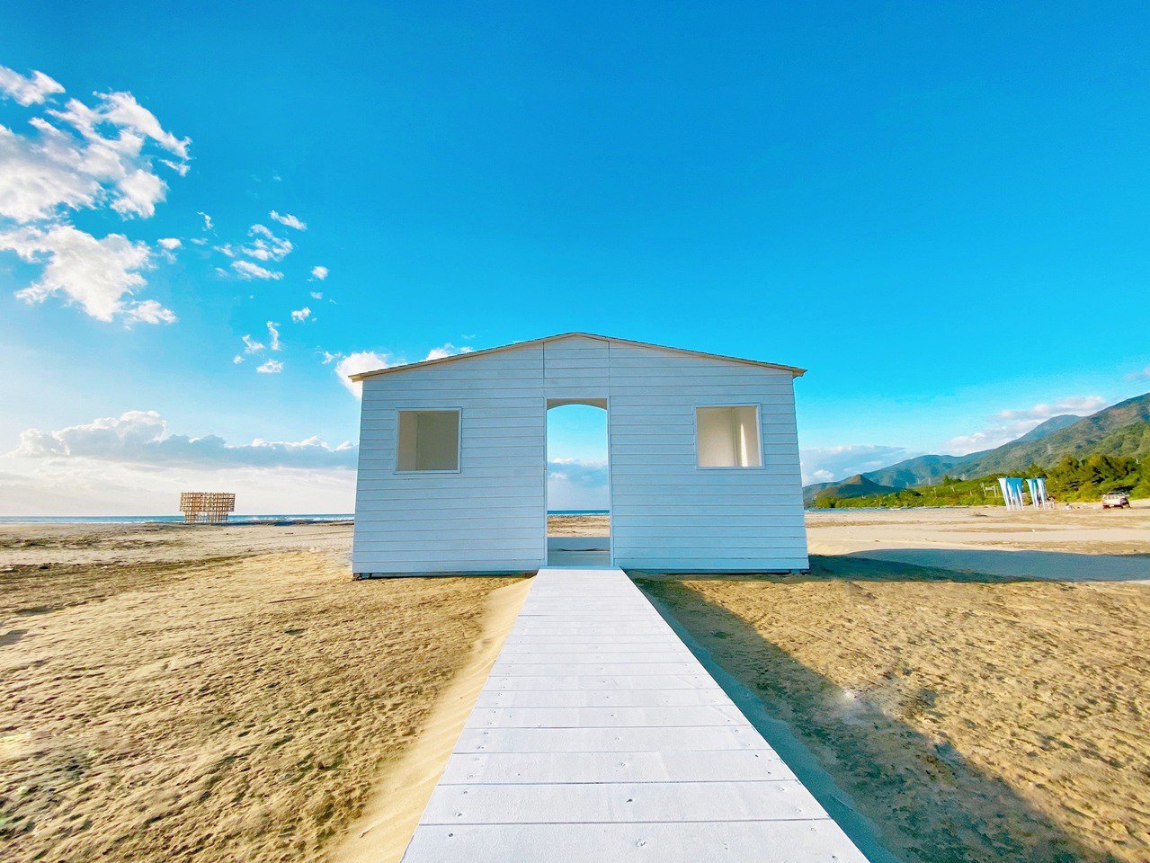 2021年落山風藝術季將於25日在屏東縣車城鄉海口港登場,展出18件大型地景裝置藝術,作品陸續架設完成,日夜呈現不同的美感。圖/屏東縣政府提供