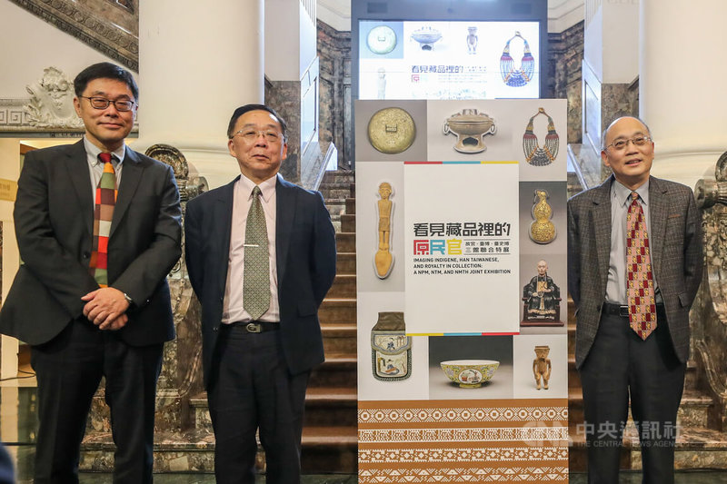 「看見藏品裡的原、民、官:故宮、台博、台史博三館聯合特展」3日在國立台灣博物館舉辦開幕典禮,故宮博物院院長吳密察(右)、台博館館長洪世佑(中)、台灣歷史博物館館長張隆志(左)出席揭幕。中央社記者裴禛攝  110年1月3日